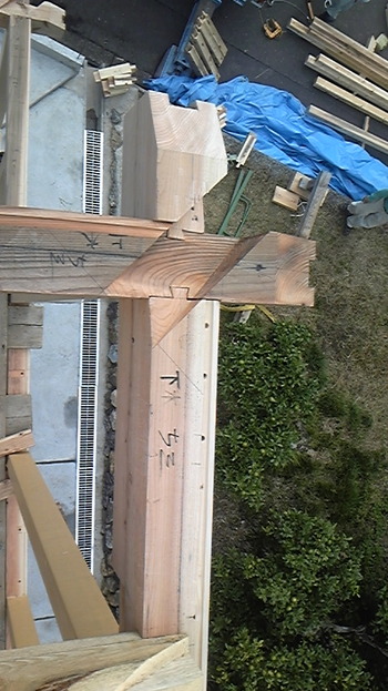 H・O様邸構造 桁を渡りアゴで納めて隅木の収まる部分を欠き込みしています。欠損部分はすべて木組みにより埋められる丈夫な隅の納まりになります!