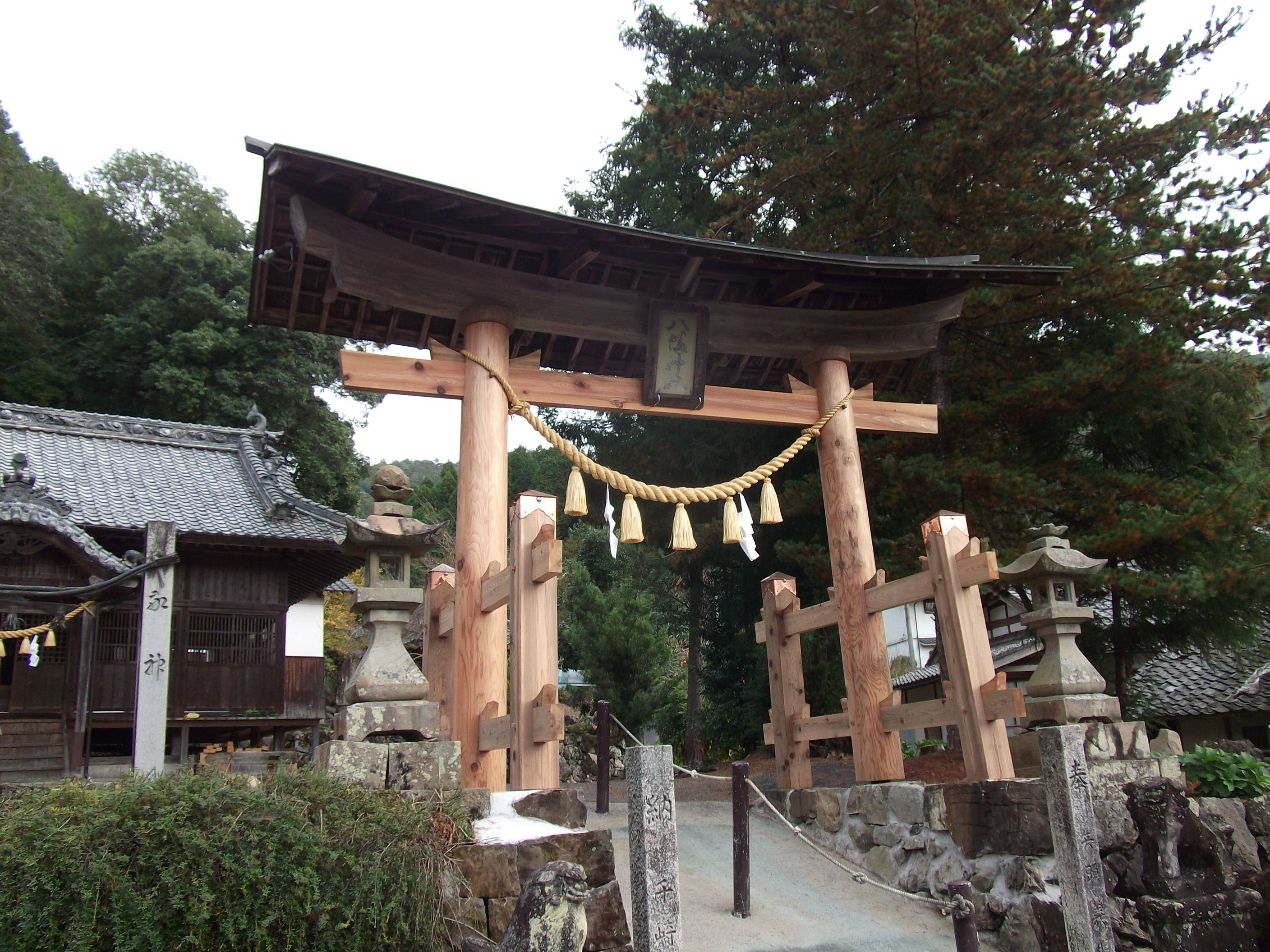 八幡神社大鳥居 下相八幡神社の大鳥居島木・屋根は既存の再復旧、柱・大貫・袖柱は新設(H23.10)